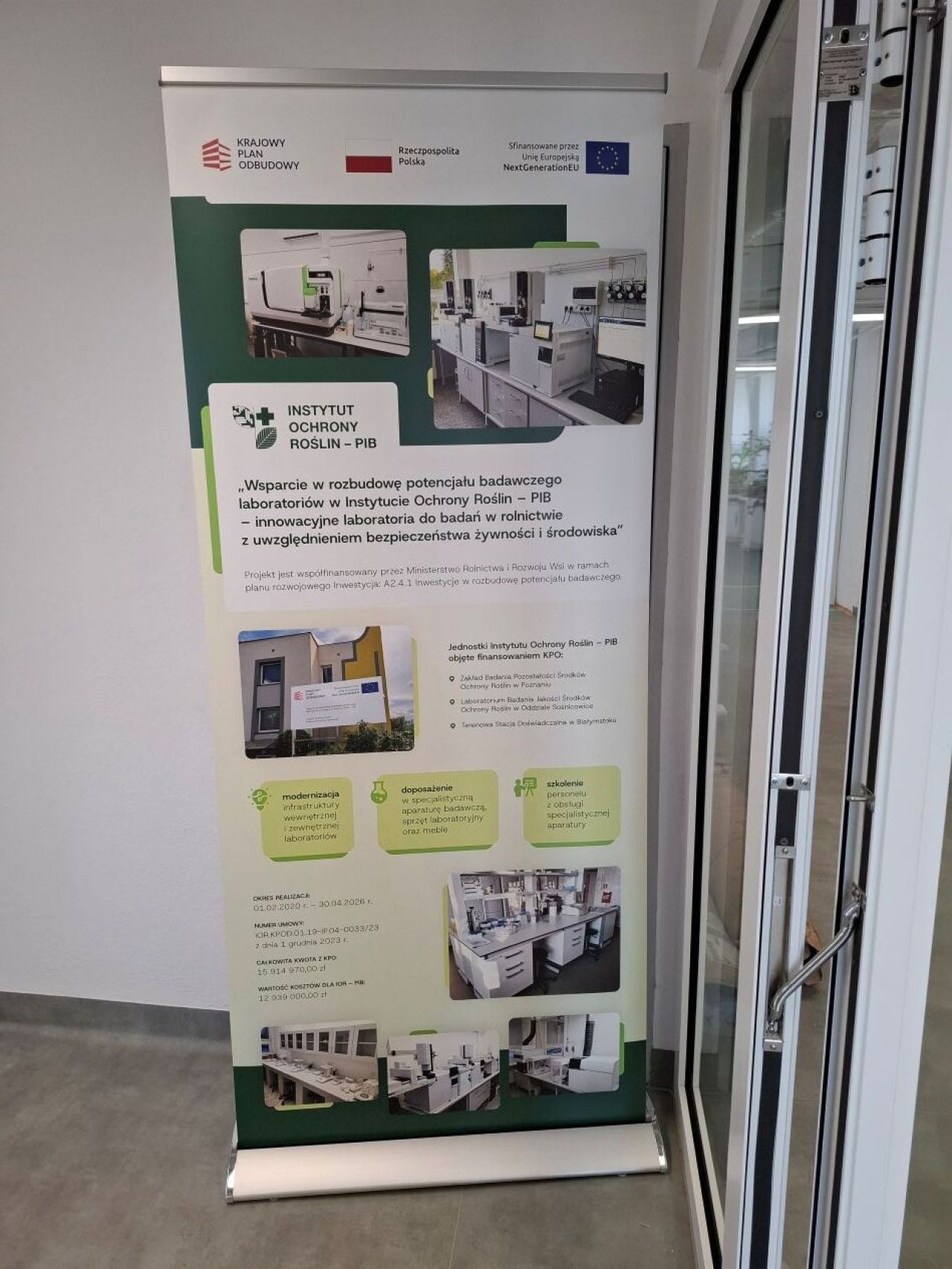 Inwestycja realizowana jest w ramach Programu „Krajowy Plan Odbudowy i Zwiększania Odporności (KPO)” dla części inwestycji A2.4.1 „Inwestycje w rozbudowę potencjału badawczego dla części inwestycji: budowa lub modernizacja laboratoriów instytutów”, nr umowy KPOD.01.19-IP.04-0033/23, pn. „Wsparcie w rozbudowę potencjału badawczego laboratoriów w Instytucie Ochrony Roślin – PIB – innowacyjne laboratoria do badań w rolnictwie z uwzględnieniem bezpieczeństwa żywności i środowiska”.